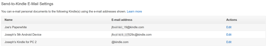 2. Go grab the e-mail address for your Kindle from your Personal Document settings (https://www.amazon.com/hz/mycd/myx#/home/settings/payment; pretty far down on the page). If your device doesn’t have an e-mail address, add it: